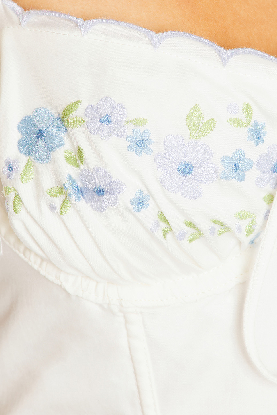 Home / All / Dresses / Mini Dresses / White Embroidered Halter Button Loop Closure Bustier Design Underwire Cups Sweetheart Mini Dress