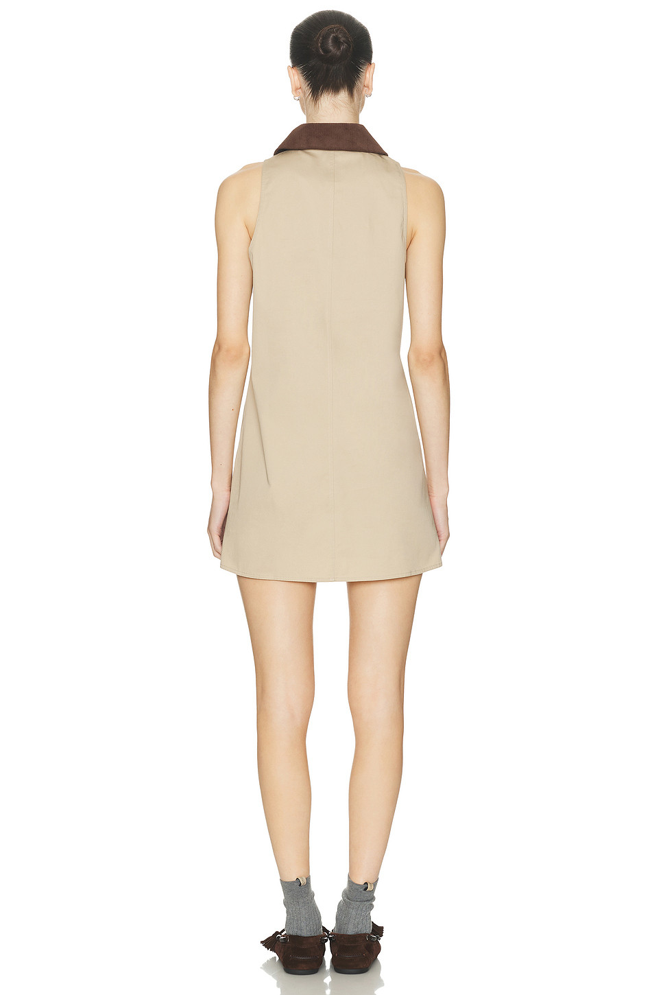 This is a sleeveless dress. It features a collar with a dark brown contrast, adding a touch of sophistication. The dress has a zip-up front, making it easy to put on and take off. The main body of the dress is in a light beige color, giving it a clean and elegant look. It has a simple and straight silhouette that falls above the knees. Paired with gray socks and brown loafers, it creates a stylish and preppy outfit.