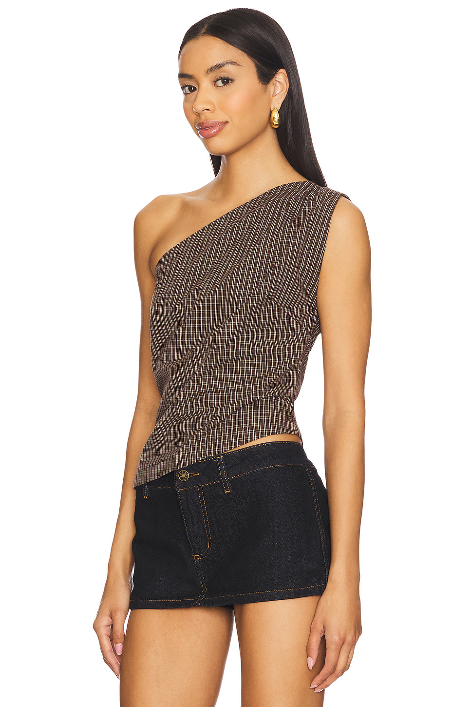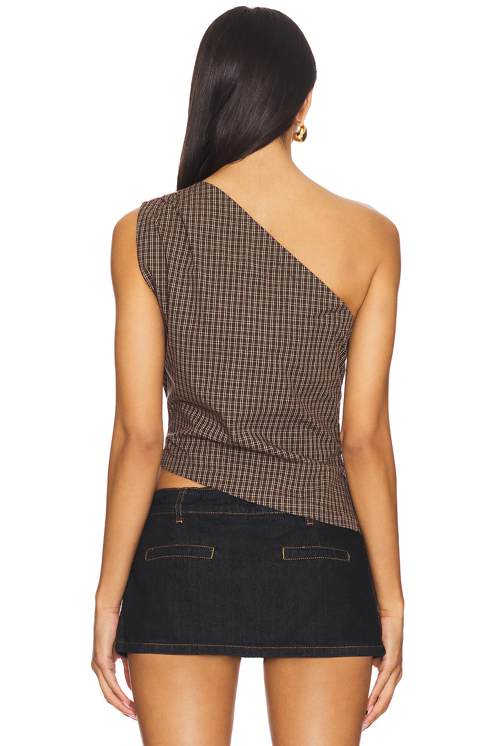 This top is a one-shoulder, sleeveless design with a chic and modern silhouette. It features a brown and white checkered pattern that adds a classic yet trendy touch. The fabric appears to be a structured weave, offering a tailored fit that cinches at the waist to accentuate the figure. The asymmetrical cut and the subtle draping detail on the shoulder create a sense of sophistication and playfulness, making it a versatile piece that can be dressed up or down. It pairs seamlessly with high-waisted denim shorts, as shown, and would also complement skirts or tailored pants for various occasions, from casual outings to semi-formal events.