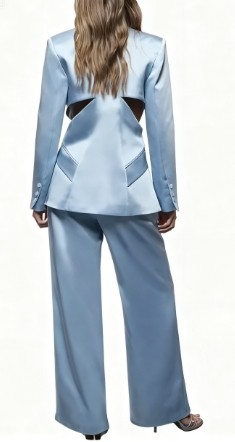 This image features a woman wearing a light blue satin suit set. The blazer has a tailored design with a notched lapel, a single front button, and a distinctive cutout detail on the side. She pairs it with matching light blue trousers. Her hair is styled in loose waves, and she wears small hoop earrings. The background is a solid mustard yellow, and there's a text overlay in the top right corner that reads "Extra 20% Off Ends.