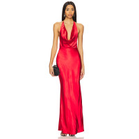 This dress is an eye-catching red long dress with a neckline. It features an elegant deep V neckline design. The tie design at the neckline adds a touch of detail and sophistication.