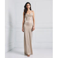 Stunning Custom made Draped Metallic for Ladies featuring alluring back ruche and cut out dress. This 60% nylon and 40% metallic fibre blend dress has slight elasticity. It's a fitted maxi with a satin bustier top. The front is draped, the back has ruched details and a cut - out. Adjustable thin straps, a concealed back zipper and hook closure. It offers a unique metallic effect, making it an elegant pick for special occasions.