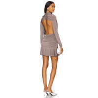This is a backless dress. The high collar and long sleeves design add an elegant touch. The large area of bare skin on the back combined with the exquisite button decoration makes it both sexy and unique. There is pleated treatment in the middle of the dress, which can shape the figure and add layering effect. The skirt has a pleated style at the hem, which is playful and lively. The overall style is fashionable and eye-catching, suitable for social occasions such as parties and banquets.