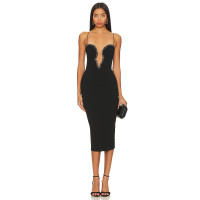 Sexy Beaded Crystal Embellished Black Halter Neck Back Slit Crepe Fabric Midi Dress