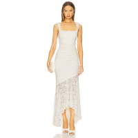 Hot Sale Elegant White Square Neckline Lace Pleated Design Asymmetric Hem Women Long Dress