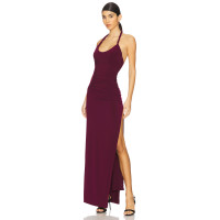 Burgundy Halter Neck Backless Ruched Split Midi Weight Bodycon Plain Weave Fabric Long Dress