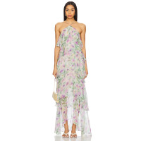 Pale Floral Print Halter Neck Layered Chiffon Multiple Ruffled Tiers Back Slit Women’s Midi Dress