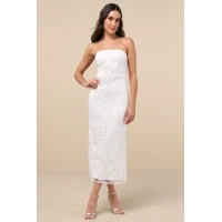 Elegant Bandeau Neckline Sleeveless Tight Waist Side High Slit Floral Embroidered Dress