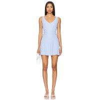 2025 Hot Sale Summer Elegant Light Blue V Neck Sleeveless Flounce Women Mini Dress This garment is made of 100% polyester and manufactured in China. It is dry clean only. Designed with an unlined structure, it features a hidden side zipper for closure.