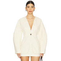 Medium Weight Knit Fabric Beige Tweed Double Breasted Gold Buttoned Cuff Design Blazer This blazer features a main fabric composition of 58% cotton, 32% polyester and 10% other fibers, with a 100% polyester lining. It is designed with a double-breasted closure, front pockets and buttoned cuffs, crafted from medium-weight knit fabric with shoulder pads for structured shaping. Dry clean only for maintenance.