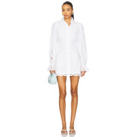 White Embroidered Floral Motifs Cut Out Details Turn Down Collar Long Sleeves Shirt Dress