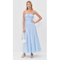 Elegant Sample Bandeau Neckline Tie Waist Smocked Elastic Bodice Solid Color Dress