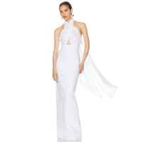 Halter neck Gown Sheer mesh Cut out Detail Bodycon Minimalist Draped Sash Woman's Long Dress