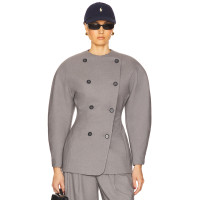 2025 Hot Sale Fashionable Vintage Puff Sleeve Double Breasted Slim Fit Grey Blazer The main fabric is 65% polyester, 24% viscose, 9% wool and 2% elastane. The lining is 55% polyester and 45% viscose. Dry clean only. It has a double-breasted front, padded shoulders, waist darts and twill fabric.