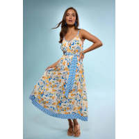 Elegant V-Neckline Camisole Spaghetti Straps Self-Tie Belted Waist Icon Print Striped Trim Dress