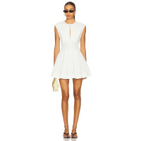 White Round Neck Slit Sleeveless Fitted Puff Skirt Midweight Poplin Fabric Mini Dress